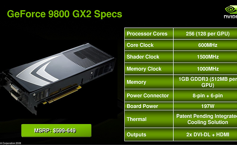 ……NVIDIAから公式のコメントは出ていないが,この基本スペックは2007年12月に発表された「GeForce 8800 GTS 512」とまったく同じ。GeForce 8800 GTS 512は,128基のSPを搭載する“フルスペック版G92”として注目を集めたが,GeForce 9800 GX2は,GeForce 8800 GTS 512相当のG92チップを2基利用して,SP総数256基のデュアルダイグラフィックスカードに仕立て上げていると考えられる。