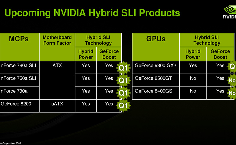 GeForce 9800 GX2は,AMDプラットフォーム向けグラフィックス機能統合型チップセット「nForce 700a」シリーズでサポートされる「Hybrid SLI」技術にも対応する。