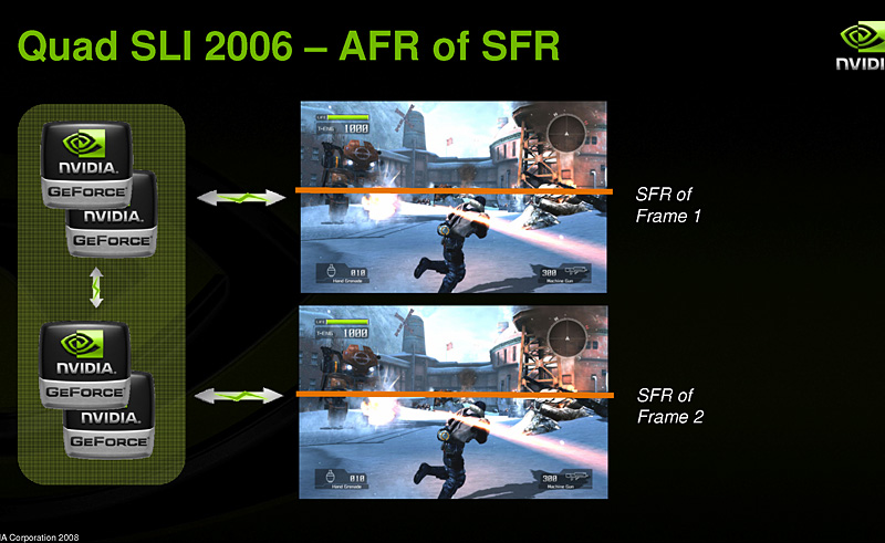 GeForce 7900/7950 GX2時代のQuad SLIは,4-way AFRのほか,単一フレームを4基のGPUでレンダリングする「4-way SFR」(SFR:Split Frame Rendering),そして1枚のGeForce 7900/7950 GX2カードが2-way SFR動作し,もう1枚のカードが次のフレームを2-way SFR処理するという「AFR of SFR」をサポートしていた(※詳細は筆者連載のバックナンバー「マルチチップソリューション『Quad SLI』の詳細」を参照)。GeForce 9800 GX2では,これらをあえて非サポートとしたわけだ。