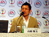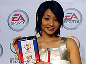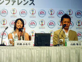 というわけで,今回も我々が訪れたのは,いつもの秋葉原Necca……,ではありません! 「2002FIFAワールドカップ」「プロジェクトFIFAワールドカップ」のプレスカンファレンス会場に選ばれたのは,恵比寿ガーデンプレイス内にそびえ立つ某高級ホテルのイベントホール。いつもとは打って変わって(というのは失礼かもだが)落ち着いた雰囲気でのタイトルお披露目となった。 この日お披露目されたのは前述の2タイトル。一つはサッカーゲームファンの人ならばすでにチェック済みと思われ,世界的に見てもサッカーゲームの連続リリースが予測されるワールドカップ前後においても,断然注目度が高い「2002FIFAワールドカップ」。そして,残念ながらPCのタイトルではないが,代表チーム監督に扮することで別の角度からワールドカップを楽しもうという趣旨のゲーム「プロジェクトFIFAワールドカップ」だ。 カンファレンスはEASq代表取締役の山本氏のスピーチによって幕を開け,その後,バイスプレジデントCS事業部長(日本語版のプロデューサー?)の高橋氏によって,両タイトルの詳しい情報が公開された。 まずは,当サイト読者お目当ての「2002FIFAワールドカップ」の情報をば。 「2002FIFAワールドカップ」(以下,FIFA2002)は,EASqのスポーツゲームブランド「EA SPORTS」の「FIFAサッカーシリーズ」最新作。2002年5月31日より開催される日韓共催の「2002 FIFA ワールドカップ韓国・日本」を背景に,各国の代表イレブンを操作してワールドカップの雰囲気と興奮を体験できるアクションスポーツ……というかいわゆるサーカーゲームだ(ちなみに,昨年同メーカーから発売された「FIFA 2002 ロード・トゥ・FIFA ワールドカップ」とは,同シリーズながらも別タイトルなのでご注意)。 この「FIFAサッカーシリーズ」といえば,ワールドカップを主催するFIFAに加盟する32か国の代表チーム,20都市にわたる開催スタジアムを全て実名で塔載しているのがウリ(もちろん"2002 FIFA ワールドカップ公認"というのがなせるワザだ)。しかも開催日程やマッチスケジュールまでも完全再現し,ゲームファンのみならずサッカーファンの心を鷲掴みにしてきたある意味"PCサッカーゲームのスタンダード"ともいえるタイトルだ。いうまでもなく,今回お披露目されたFIFA2002は2002年の日韓共催ワールドカップを元にしているため,選手の個人データやスタジアムもすべて最新のソレが用意されている。 また,高橋氏が「やってナンボ」というだけあって,スルーパス(スペースへのパス)を始めとした洗練されたシステムや,リアルなキャラクターのモーションなど,"ゲーム性"においても同ジャンルのタイトルでは群を抜いているといっていいだろう(ちなみに,1999年からはモーションキャプチャーのアクターに"中田英寿選手"を起用しているのも有名なハナシ)。 打って変わって,この日お披露目されたもう一方のタイトルは,PS2専用ソフト「プロジェクトFIFAワールドカップ」。 実をいうと,本作は完全にEASqのJapanスタジオのオリジナルタイトルで,プレイヤーがサッカーチームの監督に扮して,チームの運営,スケジュール管理,そして采配を行うというもの(一時期流行したセガの「さかつく」を想像するといい)。サブタイトルもズバリ「〜それなら君が代表監督〜」と挑発的なもので,時折世間の冷たい風当たりを受ける代表監督に「それだけいうならやってみれば?」的なノリで体験させようというものだ。 同タイトルの開発プロデューサーの大橋氏は,「代表チームを外から見るのと,内から見るのとではワケが違う」「負けたくないという気持ちが先行して,どうしても地味な試合をしてしまう」など,実際にプレイしたときの心境をプレイヤーの視点から語ってくれた。さらに,「日頃テレビを見てヤジってる人にもぜひプレイしてもらいたい」とのこと。"プロジェクトFIFA"はアクション性を排除し,主にシミュレーションに重点を置いているため,アクションよりもサッカーの知識の量で勝負したい人にもオススメとのことだ。 残念ながらPCでのリリースは予定されていないが,2002年のワールドカップをより楽しく観戦するアイテムとして,プレイしてみてもいいのでは。 高橋氏のタイトル紹介の後,特別ゲストに迎えられたのは,なんとCMや映画で活躍し,押しも押されぬ超人気アイドルの「真鍋かをり」さん! 真鍋さんは,「2002FIFAワールドカップ」を使用して開催されるサッカーゲームの世界大会「ワールド・サイバー・カップ」(説明は後述)のキャンペーンガールとして起用され,同タイトルを盛り上げるため一肌脱いでくれるそうだ(一肌です)。 ゲーム内容に対する質問と同じぐらい(?)真剣に質問攻めに出るプレスに対して,真鍋さんは「このタイトルやりました! 選手の動きやスタジアムの臨場感が素晴らしいですね」「プレイしただけでホントにワールドカップの雰囲気に浸れるんですよ〜」と,思いがけず(?)アツく語ってくれたぞ(その後に行われたフォトセッションでも,FIFA2002のパッケージを手にニコやかに微笑む彼女に,
