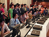 本日2002年7月5日,コーエー本社ビルの特別室にて,コーエー初の本格RTS「三國志 Battlefield」の記者発表会が行われた。 一般のメディアにプレイアブルな(遊べる)バージョンが公開されるのは初めてということもあり,PCゲーム1タイトル,しかも2度めの発表会にも関わらず,60人以上の取材陣が集まる大規模なものとなった。 さて,まずはコーエーの発表会で恒例の,シブサワ・コウ氏の挨拶から始まった。興味深かったのは,この三國志 Battlefield,そしてプレイステーション2用ソフトとして開発中の「信長の野望 ONLINE」に引き続き,来年にまた違うネットゲームを何本かリリース予定という話。シブサワ・コウ氏曰く,一つはジャンルもまた先述の2作と違うもの,つまりRTS,MMORPG以外になるということだったのだが,果たしてどんなゲームになるのだろうか? その後,コーエーのネットゲーム全般を纏めている松原健二氏,そして三國志 Battlefieldのプロデューサーの上野彰三氏が,ゲームの開発状況を語った。 ……とはいえ,当サイトとしては先月コーエーに伺って聞いた話ばかりだったので(その内容は,Previewsの「こちら」に掲載),新しく判明した点に絞ってお伝えしよう。 三國志 Battlefieldのロビーサーバーは,従来のコーエー作品で使われていたテキストベースのものを使わず,「ダイナスティロビー」と呼ばれるグラフィカルなものになる。 「ロビーでも三国志を演出しています」 と上野氏が語ったように,ロビーは"洛陽の町"という設定になっている。ここでプレイヤーは自分のキャラクターを操り,ほかのプレイヤーのキャラクターと会話を楽しんだり,対戦相手を見つけたりするわけだ。対戦相手が見つかれば,一緒に「酒家」に入って三國志 Battlefield本体のゲームスタートとなる。 また,このキャラクターはゲームの結果によって成長していく。成長は官位によって表されるので,最初に最高の官位(皇帝?)に誰が最初にたどり着くのか? といった楽しみもあるだろう。そのほか,仲のいいプレイヤー(「義兄弟」と呼ばれる)がオンラインになると分かる機能や,メール機能もあるなど,MMORPGでよくあるコミュニケーション機能はほとんど用意されている。つまり極端にいえば,このロビーは"戦闘が三國志 Battlefield"のMMORPGなのである。 今後のスケジュールだが,まず2002年7月10日からβテストが開始される予定だ。そして7月下旬には,海外でのβテストも始まるとのこと。開発は順調で,予定通り8月末には日本,韓国,台湾で同時に発売されるようだ。 価格は未定で,おそらくパッケージ料金とは別に月額利用料が必要となるだろう。 ところでこの発表会のあと,取材陣が実際に三國志 Battlefieldで遊ぶことができたのだが,30分経っても1時間経っても,みんな帰らずに遊んでいたのが印象的だった。(Iwahama) なお,三國志 Battlefieldについての情報は,当サイト内の記事をまとめた「こちら」からどうぞ。