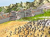 ECTS会場から程近いホテルの一室で,本誌スタッフはイギリスの奇才ピーター・モリニュー(Peter Molyneux)氏を始めとするLionehad Studios社の面々と会談。「Black & White」の続編として発売直後から話題に上がっていた,「Black & White 2」のデモを見せてもらうことができた。 モリニュー氏によると,Black & Whiteシリーズは「Black & White 5」まで制作される予定となっており,Lionhead Studios社のウィングとしてB&W Games社を設立。そこで,まだ若いジョンティ・バーンズ(Jonty Barnes)氏がリーダーとなって,続編やアドオンのデザインを行っている。Black & Whiteシリーズは,更新していくたびに時代が進んでいくという設定で,それに従い部族民たちの文明も進化していくというものになっていくらしい。 「Black & White 2」では,神々の存在を知った地上の民が知恵を付け,その神の化身であるクリーチャーから戦いによる征服を学んだことになっている。人々が武器を発達させることによりエデンの大陸に争いが頻発し,血で血を洗う世界になってしまっているのだ。実世界の歴史で例えれば,中国の三国時代やヨーロッパの暗黒時代あたりの時代設定となるのだろうか。 そこで立ち上がるのが,ほかでもないプレイヤーだ。自らのソーサラーとしての能力やクリーチャーを駆使し,この世界を統一することによって平和をもたらそうと決意し,歯向かう部族を蹴散らしていくという内容となる。 もちろんBlack & Whiteというゲームの性格上,自分の配下の部族民たちを平和に統率して,地上を緑輝く楽園にしても良いし,魔法と暴力で武力支配することも可能だ。クリーチャーばかりでなく,世界の情景や天候までもが,プレイヤーのプレイスタイルによって変化していくということだ。 開発が今年に入って始まったばかりということもあり,今回はオリジナルの「Black & White」のグラフィックスエンジンに,新物理モデルや各種機能を盛り込んだものだったが,まずグラフィックスに関して話しておくと,「Black & White」を初めて見たときの驚きが蘇ってくる。大雨や3Dで表現された雲が漂い,「Black & White」以上にカリっとした色彩が見事だ。我々に提供された画面写真も古いバージョンで,テクスチャーは前作よりも16倍の密度になるという。これは,例えば200×200の解像度を持つテクスチャーを,800×800にするようなもので,相当な細かさになるのが理解できるだろう。 とくに驚いたのが「Black & White 2」での海の表現で,3D Marks 2001の波や川のグラフィックスが比較にならないほどリアリティ溢れるものになっている。筆者は,CGの見事さを理解させるために,最初に水辺の実写を見せているのだと勘違いしたほどだ。このあたりのシミュレーション技術の高さは有能なLionhead Studios社ならではだが,「Black & White 2」では陸地ばかりでなく海上もゲームに深く関わってくるのだとモリニュー氏は語る。 しかし「Black & White 2」の中でも一番凄いのが,画面に数千という部族民を表示可能にしたことだ。部族の誇りと信仰を賭けた大掛かりな戦闘が,「Black & White 2」の醍醐味になっているのである。彼らは剣や槍を持って戦い,何百,何千という弓矢が空を飛び交う。それぞれの矢もすべて3Dでモデリングされているため,地面や建物の屋根はもちろん,クリーチャーの体にも突き刺さり,大きな体に血を滴らせながら前線で戦うクリーチャーの姿が痛々しい。これらの武器もミッションが進むごとに進化して,スリンガー(石をヒモの先につけての投石)から弓,そして火を射掛けるというように発展していくこととなるという。これに合わせて,部族民のモデリングは,それぞれのタイプに合わせたものに細かく作り返られ,アニメーションの量も各段に増加されている。 通常の戦略ゲームのような雰囲気を想像するだろうが,このゲームにはユニットを生産する建物は存在せず,村人をリクルートして訓練することで部隊を作らなければならない。それも,プレイヤー自身が直接手をかけるのではなくて,信者の中からリーダーとなる存在を引き抜いて,彼に指導させるというやり方になるらしい。クリーチャーは,彼らの守護神として戦場に赴き,「兵士たちのモラルは,日頃からプレイヤーがどれだけ部族民たちの信仰を得ているかによって変化する」(モリニュー氏談)らしい。例えば,500人の相手に200人の部隊では味方の戦意が一気に落ちて逃げ出してしまったりするが,そこにクリーチャーが加わっていれば,死をも省みないような戦い方もしてくれるのだ。女性の村人も兵士にできるが,戦闘能力では男性には劣るようになるとのことだった。このあたりから推測すると,男性と女性の間で仕事の分担なども必要になってくるのだろうか。 戦闘に重点を置いているため,建物を建築,修復したり,壁を作ったりもできるようになった。壁は,地面の上に白線を引くだけで,後は村人に指示して作ってもらう。詳しくは語ってもらえなかったものの,戦闘やこの建築の要素が加わったことで,新しい資源も登場するということだ。ともあれ,何千という敵の