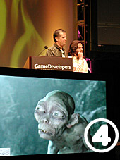 2作目に登場したゴーラムには顔だけでも700に及ぶ筋肉のパラメータを設置して細かく動かしたと,ラブリー氏は説明した。実際には,ゴーラムはアンディ・サーキス(Andy Serkis)という役者を使ってモーションキャプチャーされたので,CG映画としては類を見ない生き生きとした動作が実現したのである。元々声優として雇われたサーキス氏は,自ら志願してゴーラムを体当たり演技したのだが,ずんぐりとしたサーキス氏が跳ねたり転がり回る映像が,会場の笑いを誘っていた。