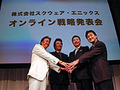 →新発表盛りだくさん! スクウェア・エニックス「オンライン戦略発表会」#1は,「こちら」 さて,同社の新作の発表を担当したのは,スクウェア・エニックスの執行役員を務める齊藤陽介氏。まずは新作を紹介するムービーが上映された。 といっても,最初に紹介されたのは「アンブロシア オデッセイ」という,PlayStation2用オンラインアクションRPG。これはこれで面白そうなのだが,forGamerはPCゲーム情報サイトなので,スルー。続いて紹介されたのは,「フロントミッション オンライン」(仮称)だ。 フロントミッションといえば,コンシューマで人気のシミュレーションRPGシリーズ。2003年10月23日には最新作「フロントミッション ザ・ファースト」がPlayStation2で発売されることもあり,これもPS2だけでの発売かと思いきや……配られた資料には「for PlayStation2 & Windows」との文字が! これは気になると思い発表会後にスクウェア・エニックスの広報の何人かに話を聞いてみたのだが,……本作(のWindows版)については,現時点ではいっさい何も語れないというつれないお返事。まぁ詳細が入り次第続報をお届けするので,お楽しみに。 このあと携帯電話(次期"FOMA")向けのドラクエ&FFの話などがあり,最後にPCタイトルの順番が回ってきた。 まず紹介されたのが,「クロスゲート」(当サイト内の記事一覧は,「こちら」)だ。といっても,ご存じの通り新作タイトルではなく,2001年から続く人気MMORPGである。じゃあどういう発表かというと,同作のプレイヤーが全世界で1000万人(!)を突破したことを記念して,2003年11月6日にわずか2980円という価格で「クロスゲート プレミアムバリューパック 疾走、ヤンキー魂。付き!」を発売するというのだ。 ちなみにプレイヤー(会員)が1000万人というのは誇張ではないようで,表(画面上段左)を見ての通り,なんと中国だけでも1000万人を越えそうな勢いなのである。2003年9月現在で,有料会員1140万人だというから,1200万人を突破するのも時間の問題だろう。 しかしながら,残念なことに,日本では伸び悩んでいるのが現状だ。そこで,この思い切った低価格での再発売となったわけである。しかし価格だけ見ると,同作の入門バージョン「今日からはじめるクロスゲート」と同じだが,本作には機能制限はない。それどころか,クロスゲート本体(8800円)はもちろん,パワーアップキット(5800円),さらにタイトル通り「疾走、ヤンキー魂。」のクライアント,さらには「コスモぐらし」のデモ版と「JUNKMETAL」(後述)のデモムービーまで同梱されているという超豪華パッケージなのである。 ちなみにクロスゲートには,近々「パワーアップキット2」も発売される予定である(しかも広報小林氏の話では,「パワーアップキット2でまたかなり進化しますよ! ご期待ください」とのこと)。まだまだ進化を続ける現役人気MMORPGが,オマケ満載で,2980円(もちろん月々の利用料は別途必要だが)。これはかなりお買い得だといえるだろう。 次に,「疾走、ヤンキー魂。」の紹介もあったが,とくに新情報はなかったので,省略。 最後に紹介されたのが,本邦初公開の,「JUNKMETAL」(ジャンクメタル)である。これは,ひと言で表現するなら,3D SF MMOFPSといった感じ。……これじゃあまりにも分かりにくいので,もう少し噛み砕いて説明すると,3Dで描かれたSF世界で,ロボットに乗り込んで,敵勢力(基本的にほかのプレイヤーが操るロボット)とバリバリアクションで戦うMMOゲームだ。本作については,別途記事を準備中なので,もうしばらくお待ちを。 さて。このあとPCタイトルだけ集めたムービーが流されたのだが,そこにはなんと,まったく説明のなかったタイトルの映像も入っていた。一つは,おそらく「これ」と思われるサッカーゲーム(しかし,かなり進化しているようだ)。もう一つは,どうやらゴルフのゲームだ。そしてもう一つ,ファンタジーRPGとおぼしき映像が……。このムービーはのちほどforGamerにUpする予定なので,自分の目で確かめよう。 発表会はこのあと,ソニー・コンピュータエンタテインメントの佐伯雅司氏,インテルの吉田和正氏,NTTドコモの夏野剛氏が壇上に上がり,順に挨拶をした。 全員社長クラスの人なので,まぁ,その手のお話が聞けたわけだ。forGamer読者には釈迦に説法なので割愛するが,個人的に面白かったのは,佐伯氏が"ゲーム遊ぶならPlayStation2とテレビが最高"と語り,吉田氏は"PCのハイクオリティな画面でゲームしよう!"と語ったあと,NTTドコモの夏野氏が"プラットフォームの共存"を謳って,見事にオチが付いたところ。最後の写真撮影時にはスクウェア・エニックスの和田社長を交えて4人で握手するシーンも見られたが,(話の内容の割には)全員笑顔がサマになっているところは,さすがお偉がた,といったところだろうか。(Iwahama) →「クロスゲート」の当サイト内の記事一覧は,「こちら」 →「疾走、ヤンキー魂。」の当サイト内の記事一覧は,「こちら」 ©2001 DWANGO/SQUARE ENIX All Rights Reserved. ©2002 DWANGO/ZENER WORKS/SQUARE ENIX All Rights Reserved. ©2003 ponsbic/SQUARE ENIX All Rights Reserved. ©2003 ATE