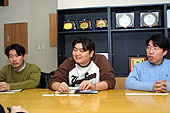 見学後に7階へと移動し,会議室でインタビューを行った。インタビューでは,開発チームのリードデザイナーのソン・テク・リ氏,プロジェクトマネージャーのボン・ウォン・チェ氏,プログラマーのイン・ホ・チェ氏が我々の質問に答えてくれた。通訳は前日にもお世話になった,キム氏とジ氏の2人に担当してもらい,質問は基本的にソン氏が答え,ボン氏とイン氏がサポートという構図で行われた。(Seal)