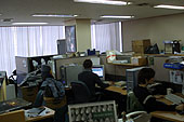 開発ルームは,意外にも整然と整理されていて,プログラマーチーム,テストプレイチーム,デザインチームなどチーム別でエリアが分かれていた。デザインチームのデスクには,日本のデザイン本があったり,ガンダムのプラモデル(RX-78GP01"ゼフィランサス"?)が置いてあったりと,
