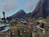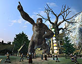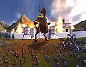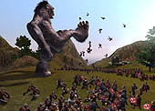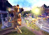 まず特筆すべきはランドスケープのレンダリング技術の開発が終了したこと。DirectX 9.0のプログラマブルシェーダ技術を使い,大海原の波や草原などはもちろん,砂浜の砂丘や夜になると怪しい青みさえ漂わせる氷河まで,非常にリアルに表現されるようになった。舞台となる島をズームアップして見ると,まるでCGアートかと思うほどゲームらしくない美しい風景が広がり,ボリューム感のある雲が漂い,時折雨を降らせている。しかし,ズームインするに従って森の木々や壁に覆われた町が見え始め,とにかくその細かさに驚かされることになる。 気象効果もゲームに取り入れられ,サルや犬など体毛の多いクリーチャーが雨に濡れると,本作で改良されたモーフィング効果によって,フワフワだった毛がべっとりと濡れたような状態になる。これは,初めてBlack & White 2が公開された2003年のGDCで行われた技術デモと同じだが,ついにゲームの中で確認できた。まだ制作中ではあるものの,風もBlack & White 2では重要となり,嵐の中では弓が使いにくくなったりするらしい。 今回初めて公表されたのが,具体的な住人達の暮らしぶりだ。Black & White 2に登場する文明は,エジプト,日本,ノース,ギリシャ,アステカの五つに絞られているが,それぞれ行動パターンに特性を持っていることが判明した。例えば日本文明であれば非常に勤労であるものの,夜になると酒場に集まって酒盛りするのが好きなのだそうだ。何よりも,帯を後ろで締めていたり,ちょんまげを結っていたりするのが面白い。卑弥呼の時代のような装束もあれば,どこか中国風の建物もあったりするが,そこはイギリス産ゲームソフトのご愛嬌だ。 また,戦闘でも文明による違いは明確になっており,ギリシャは非常に統率が取れているのに比べ,ノースは個々の能力が高い戦士だがバラバラな動きをする。ノースは狂戦士(バーサーカー)だけしか兵舎で生産できないが,日本なら弓術に重点が置かれており,街が発展するに従って侍が生産できるようになるなど,兵士ユニットにも相当なバリエーションが出ていた。 兵士ユニットを生産するために必要な兵舎は,設置するときに「Heavy Archer」などの生み出すユニットだけを一つだけ指示できる。つまり複合型の軍隊を作るには,複数の兵舎が必要になるのである。この兵舎を建てると,街で仕事のない若者達が志願してきて,それぞれに訓練されて一人前の兵士になる。こうやって,100人単位で一つの軍団が形成されて,文明を守る盾となるのである。 戦闘システムは現在のところ鋭意作成中であるというものの,無理にお願いして実際に人間同士で戦っているところを見せてもらった。これまでは軍隊を引き連れて軍隊のない城塞都市を攻撃するという,物理効果の紹介に特化したような戦闘風景しか見られていなかったからだ。 そこでバーンズ氏が見せてくれたのが,一つの歩兵軍団しかないギリシャ対ノースの戦闘だ。まだまだ迫力があるとはいいがたいものの,恐怖心に駆られて逃げ出したりする兵士がいるなど,個々のユニットがユニークな動きをしているのが面白い。これが,最終的には弓兵や騎馬兵も交えた数百人規模の大部隊となって戦い合うのだから,通常のRTSのような緊迫感のある戦闘も期待できるのだ。 またこれらの軍隊は,"リーシュ"と呼ばれる空想の糸で結びつけることで,移動も簡単にできるようになる。先頭の歩兵隊の後ろに二つの弓隊を結び,さらに背後に騎馬隊をつなげるという要領で,プレイヤーは先頭の軍隊を動かすだけで大群を率いることができる。先頭のユニットにはクリーチャーを使用することもでき,功城戦ではクリーチャーに壁を破壊させて中に侵入するという芸当も可能だ。今回のデモでは,勝利したノース軍に対してライオンのクリーチャーを召喚してみると,足にまとわりつく人間達を蹴り散らす動作をして見せたのも,本作のAI技術の高さを物語るには十分だった。 今後の開発課題は,戦闘でのバランス調整や,プレイヤーの行動によって世界の風景が変化する悪性(Black)と善性(White)のアライメント。そしてグラフィックス部分では影をインプリメントする必要もあるという。グラフィックスエンジンは前作のものをコアにしているため,スペックは以前と同じ800MHz以上のCPUと16MB以上のメモリを搭載したビデオカードと,かなり低めに設定されている。もっとも,DirectX 9.0に対応したビデオカードでなければ,毛皮の様子や波の反射,ミラクルの壮大な効果などは見られない。 気になる発売日は,バーンズ氏の口からは漏れることはなかったが,2004年末か2005年あたりではないかと推測される。大きなセールスには結び付かなかったものの,本シリーズはモリニュー氏もじっくりと制作していくことを決心しているようで,Black & White Studios社という子会社に分離してバーンズ氏に指揮を取らせている。この作品には,「納得できるまで開発を続ける」という開発魂が込められているのだ。(奥谷海人) →「Black & White 2」の記事一覧は,「こちら」 All rights reser