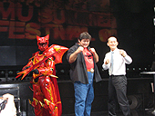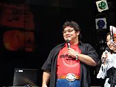 韓国の多くのMMORPGに導入されている攻城戦も搭載予定。攻城兵器などは登場するのか? どういったシステムなのか? 不明な点は多いが,なかなかに楽しみである。 韓国導入時期:2004年9月導入予定 日本導入時期:2004年冬以降 ■6地域対抗ワールドバトルの開催 ミューは韓国,中国,日本,タイ,台湾の5地域で運営されているが,2004年8月からはフィリピンでもサービスインとなる。6地域に拡大したことを記念して,ゲーム内のイベントシステムであるバトルサッカーを利用した「ミューワールドバトル」を開催。ちなみに日本での予選は2004年8月を予定しているとのこと。決勝戦は2004年12月に韓国かタイで行われるらしい。 新アップデートの内容の発表後は,スペシャルゲストとして"破壊王"こと橋本真也氏が登場。軽快なトークのあとには,"100人切り"と称して,ゲーム内に破壊王というキャラクターで殴りこみ,ほかのプレイヤーと対戦を行った。 ただ,ゲーム内に人が集まりすぎて,橋本氏のキャラクターがいることに気がついていないプレイヤーが多く,破壊王は人ごみに隠れながら暗殺者のような動きで,まわりのプレイヤーを倒していた。逆にそれが会場のファンには大ウケ。一般プレイヤーの操作するキャラクターが「あーっ!」と悲鳴を上げて倒されるたびに会場では笑いが巻き起こっていた。 また会場では各人に同絵柄の4枚のカードが配られていた。カードにはグー/チョキ/パーの3種があり,会場でトレーディングを行い,コンプリートした人のみが参加できる(といってもほとんどの人がコンプリートしていたようだ)"じゃんけん大会"も開催された。勝利者にはミューの好きな装備一式やジャガーの自転車など豪華商品が贈られただけでなく,希望者には,橋本真也氏からチョップがもらえるというサービスも。 イベントのフィナーレには,2004年7月15日のパッケージの発売が告知され,すでに1万本以上の予約が入っているとの景気のいい話も。最後は橋本真也氏の合図のもと,格闘業界だけではなくスポーツ業界でも話題の"ハッスルポーズ"でシメとなった。 今回のイベントは,実に盛りだくさんな内容であった。会場でのトークや発表だけではなく,体験コーナーやミューのアイテムがもらえる「ミューガチャ」なども設置。フードやドリンクも充実しており,さらにドラゴンと一緒に撮影できるスペースが用意されているといったサービス振りには,多くのファンが満足したに違いない。国内で行われたイベントとしては,トップクラスの充実振りだといっても過言ではないだろう。 帰りがけにイベントスタッフに話を聞かせてもらったところ,ミューガチャは1600個も用意したのに,数分で完売。お客の動員数も600名超とのことで,かなりの盛況だったとのこと。また,これだけの人数を動員すると,何かしらもめ事などが起こりやすいのに,今日のお客さんは良い人が多いですねとホメていた。これもミュープレイヤーの傾向の一つなのだろうか。 こうしてイベントは終了。参加者達は出口でおみやげ(ミューをテーマにした飲料)をもらい,みな満足しているようだった。(Murayama) →「ミュー 〜奇蹟の大地〜」の当サイト内の記事一覧は,「こちら」 (c)2001-2004Webzen All Rights Reserved. Licensed to (c)2004GameOn Co.,Ltd