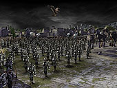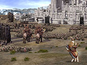 まず,サウロン軍でプレイできるアイゼンガードのマップ。ファラミアの手勢たちが守るアイゼンガードの廃墟を,力ずくで奪取するのが目的だ。マップは,右下の自分の陣地を中心に3分の2程度がFog of Warで覆われており,中央を遮る川をまたいだ攻防戦となる。注意すべきはマップ中央と上部にある敵陣で,敵の本陣へなだれ込むには必ず攻略しておかなければならない。 このマップのゲームルールで面白いのは,オーク歩兵は半無限にプレイヤーに供給されるということだ。ゲーム開始時には,すでに牙が地上に突き出したような祭壇風の本陣を中心に,いくつかの施設を建設できるようになっている。バラックを作ると,そこから次々とオークが飛び出してくるのである。 注目しておきたい部分は,施設は決められた部分にしか設置できなくなっていること。本陣の周囲に六つのサークルが浮かび上がっているのだが,このサークルをクリックすれば4種のアイコンが表示され,それぞれバラック,トロールの調教基地,カタパルトの製作所,資源の生成所(らしき建物)を建設できるようになる。歩兵や弓兵のような雑魚ユニットは10人単位のグループ(このゲームではホードと呼ばれる)で生産され,コントロールもすべて10人単位で行われる。このホードをクリックした後に別のホードをクリックすることで自動的にグルーピングされ,巨大な軍団でもマネージしやすくなるのである。 生産速度は遅いが,トロールやカタパルトを供給するのは不可欠。次々と飛び出してくる歩兵団に数匹のトロールやカタパルトを同行させておくと,かなり強力な部隊になってくれる。とくに,カタパルトは遠方からの投石による攻撃が凄まじく,建物ばかりでなくユニットにも非常に有効だ。カタパルトの投石が着弾した場所の敵ユニットが弾け飛ぶのは,トロールのなぎ倒しと同じくらい見た目にインパクトのあるアニメーションだった。また,敵もファラミア騎馬部隊の決死の突撃戦法を発動し,三つある橋の攻防を巡って激しい戦いが楽しめた。オベリスクのような敵の本陣を潰せば,ムービーが始まってミッションが終了する。