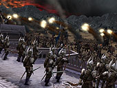 ヘルムズ・ディープは,数少ないローハンの残党を使い,ガンダルフの支援部隊が到着するまで16分に渡って城を守り抜くというゲームモードだった。ヒーローユニットとして,アラゴルン,ラゴレス,ギムリ,そしてセオデンの4人が使用できる。 このマップでは,まず城の警備配置を行うのに3分が与えられ,プレイヤーは弓兵しか生産しないバラックを指定の場所に建て,ハルディアのエルフ軍を場内に引き入れて第一門を閉める。ちなみに弓兵のバラックでは,アップグレードするとより殺傷能力の高い火矢が使用できるようになる。この火矢の生産は,専門工具を荷馬車につけた労働者がバラックから出てくるだけなので,彼らをすでに配備している弓兵ホードにクリックしてあげなければならない。 3分経つと,法螺の音が聞こえてミニマップ上に白い点の大群が写り始めるのが見える。カメラを移動させてみると,ホードの集まりが大群へと姿を変えて,城の前で隊列を組み気勢を上げているのも確認できる。映画のあのシーンさながら,これからこんな大量のサウロン軍と戦うのかと思うと,否が応でも緊張感が増すシーンである。 第1陣は,ハシゴを城壁にかけてよじ登ってくるオークたち。あまり強力な相手ではないので,普通にプレイしていけば必ず防御できる。ハシゴは弓兵の攻撃で倒れるので,じっくりプレイすれば第1陣は問題なく阻止できるはずだ。弓兵は歩兵には弱いので,なるべく城壁に上げないように頑張らなければ,生産が間に合わない。 問題なのは第2陣。ウラク=ハイの部隊はもちろん,爆弾を抱えた突撃兵士も登場するのである。現状では,この自爆兵を弓で阻止することはできないようになっているので,必ず壁が崩されることになる。最終的には,阻止しても何度も突撃してくるので,やがては爆破されるとのことだ。壁が崩れるとそこからオークたちが乗り込んできて,次々と弓兵を切り倒しながら施設の破壊をはじめる。アルゴルンたちだけでは対応できる人数ではないので,彼らヒーローキャラクターを要所に置いて殿軍とし,すみやかに弓兵たちを城内に退却させて第2門を閉じるのが得策なようだ。この時点で,まだ8分ほどの時間が残っていた。 第3陣の襲来ではバッテリーラムが投入され,門も案外簡単に破壊されてしまう。城内にも弓兵バラックを設置できる場所があるが,この頃になると防戦一方の弓兵部隊の兵力も落ちており,ほぼタイマーとのにらみ合いっこになってしまった。
