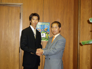 写真左は,ガンホー代表取締役の森下氏(左)と栄町町長の川崎氏(右)
