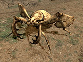 ・Hunter Antlion(ハンターアントリオン) 非情の獣人アンティカですら忌み避ける,砂漠の巨虫。その堅強な顎で捕えられた獲物は,骨と皮(殻)になるまで体液を吸い尽されてしまう。アンティカの執拗な掃討によりクゾッツで姿を見ることはなくなったが,秘境アットワ地溝には,まだ大量に棲息している。どこまでも獲物を追跡して仕留める狩人タイプと,土中に潜んで近づいた獲物を仕留める伏兵タイプの2種が知られる。ハンターアントリオンは狩人タイプ。