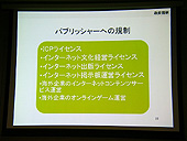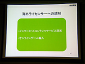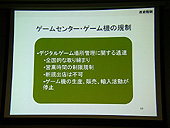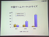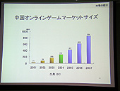最初に行われた黄氏の講演だが,ここでは中国のゲーム市場の現状と参入時の注意点の解説,そして今年の10月に中国の北京で開催されるインターネット・コンテンツ展示イベント「Internet & Entertainment Content EXPO(以下,IECE)」の紹介などがなされた。 まずは,中国でオンラインゲームが普及した理由,そして家庭用ゲーム機が普及していない理由などを説明。海賊版のシェアが96%にものぼり,パッケージビジネスが成り立たない深刻な状況の中,PCオンラインゲームが海賊版対策になり得ていた経緯などを語り,その後で日本のゲームメーカーが中国へ進出するときの注意点を列挙。中国政府との付き合い方や,現在中国政府のゲームに対する規制がどうなっているかなどを順を追って説明していった。 黄氏によれば,日本のゲームメーカーの中国進出に関しては,現地の法人と提携し,あくまでも「ライセンサー」という立ち位置で望むのが「もっとも楽」だとのこと。中国国内で運営/パッブリシングまでやろうとすると,文化部,情報産業部などといったゲームを担当する各種政府機関から,「インターネット文化ライセンス」「インターネットパブリッシング・ライセンス」などといった各種のライセンスの発行を受けなければならないという。また中国国内でインターネットサービスを実施するには,外資が50%以下の企業のみとされている件や,オンラインゲームの運営に関しては実質的に外国企業が行えないという実情を説明。「規制は非常に厳しくなってきている」と,中国市場の動向を解説した。すでに業界では周知のことではあるが,改めて黄氏の口から出て,重要性が認識されることとなった。 ただ黄氏は,政府の規制が厳しくなり進出が難しくなっているとしながらも,日本の企業,そして日本のデジタルコンテンツが中国で広く楽しまれるようになってくれることを期待していると語り,日本企業のIECEへの参加を望む旨を述べた。