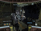 ユニークなのは,武器の照準十字(レティクル)を使って,画面上の地点をターゲットすることで,彼らの目標となる破壊地点などを設定できることだ。「Rainbow Six 3」などでも見られた手法ではあるが,理に適っている。同様に,先に挙げた地雷やドアなどのスポットにレティクルを当てることによって,その場所固有の指令を出せるようになるのである。