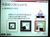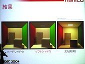 さて,今回の今給黎氏の講演では,ソフトシャドウの独自アルゴリズムと反射付きPRTを実装したシェーダーについて解説が行われた。ソフトシャドウに関する技術では初日のNVIDIAによるNaluの例など,UV面へのシャドウを2次元ブラー後に張り直すなど,実用的なアルゴリズムも提案されている。ただ3次元のものを2次元で処理するのでブラー量などが正確ではなくなる。パースが付いた面など,場合によっては不自然な影になるかもしれない。