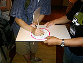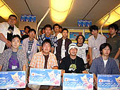 左はれいんまん選手。写真中央は,3位になった(あくま)pooh選手(右の集合写真で,前列の向かって右から二人めの,帽子をかぶった人)が,ほかの選手達のサインを集めている様子