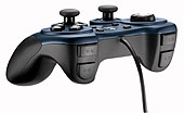 GPX-500は,8方向キーと12個(ボタン10個と左右スティック押し込みの12個。これにモード切替ボタンとバイブレーション機能のオン/オフボタンがある)のボタンに加えて,2本のアナログスティックを搭載しており,コントローラ形状が家庭用ゲーム機のものと似ていて使いやすいのが特徴。ボタンの配置なども家庭用ゲーム機で慣れ親しんだ人に馴染みやすくしており,グリップ部にはラバー素材を使ってフィット感を増しているのが魅力的だ。本体サイズは,15.5×6.5×10cm(横×高さ×奥行き)。 カラーはブルーメタリックとブラックの2色が用意され,デュアルバイブレーション機能も搭載。本体重量は260グラム(ちなみに,プレイステーションのDUALSHOCK2は本体重量約166グラムでケーブルも含めると約260グラムで,PC用コントローラの重量は220グラム〜240グラムほど)で,使い始めは少々重く感じるかもしれないが,しばらく使用していればとくに違和感なくなるだろう。