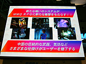 シェンムーIIをベースとしているだけで,ストーリーやシナリオは申し分なく,十分大きな特徴といえるだろう。鈴木氏は,さらに本作最大の特徴として,"バトル"を挙げた。 4Gamerの熱心な読者なら,韓国での発表会のNews「こちら」で,鈴木氏が同じ内容の話をしていたのを覚えているかもしれないが,せっかくなのであらためて紹介しよう。 鈴木氏は,オンラインゲームでは激しいアクションは難しいとしつつ,「しかしあえてチャレンジしました」と語った。先ほど掲載したムービー「こちら」を見て頂ければ分かるとおり,本作の戦闘シーンは,まるで鈴木裕氏の代表作「バーチャファイター」を彷彿とさせる,派手で激しいものなのだ。果たしてMMOというジャンルで,ここまでのアクションが本当に可能なのか,これまで数々の不可能を可能に変えてきた鈴木氏の手腕に期待したい。