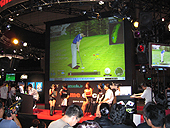 始まる前からハンディキャップを背負っての開始となったGift氏だが,そのプレイ振りは至って冷静で,ときにはピンチに陥りながらもミラクルショットでFairyPeanuts選手や来場者を驚かせていた。なかでも,両者同スコアで迎えた4ホールめ,Gift選手はバンカーにボールを落としてしまいながらも,なんとバンカーからチップインするという神業を披露。会場からも大きな歓声が聞こえていた。 試合はすべて解説と実況付きで行われていたが,途中には同ブースではお馴染み,ショットオンラインの韓国イメージキャラクター李さんが登場し,雑談などを交えつつ試合を楽しんでいた。また,同作の開発を手掛けるOnNetのCEO,Kim Kyung Man氏も登壇。李さんが,今(自身が)着ているコスチュームをゲーム内に実装してほしい,と言ったのに対して,Kim氏は快く"分かりましたと"とあっさり返事をしていた。何でも早速作成に取り掛かるだそうなので,登場する日も近いかも? さて,そんな会話が時折聞かれながらも,試合は両者同スコアのまま最終ホールである9ホールめに突入。レベル差をものともしない大接戦であったわけだが,最終的にはGift選手がバンカーにボールを落としてしまい,FairyPeanuts選手が順調にパットを沈めて勝利となった。残念。