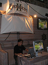 3D MMORPGの最高峰とも評される「エバークエスト」の後継作。展示されていたムービーは,日本語のアナウンスに合わせてパーティの冒険の様子が見られるというもので,オーク砦での戦闘や,Cazic-Thuleの探索シーンなどが堪能できた。ムービーの最後は,寺院でドラゴンと対決するというものだったが,圧倒的な強さを誇るドラゴンの前にパーティが全滅するという内容。 ちなみに会場で直撮りしてきたムービーは「こちら」にUpしてあるので,ぜひとも見てもらいたい(E3 2004でのものとほぼカブるのだが)。また「エバークエスト II」だけはほかのタイトルと異なり,スタッフによる"チュートリアル→初心者島"のデモンストレーションなどが行われ,NVIDIAブースには10台以上のPCを使った巨大な個別スペースが設けられていた。世界的なタイトルだけに,扱いも別格といったところだろうか。ブースレポートは「こちら」からどうぞ。