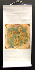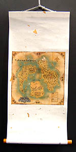 以前「こちら」のNewsで,2004年11月3日発売予定の「ウルティマ オンライン 武刀の天地」を予約すると,特典として「徳之諸島掛け軸マップ」がもらえると紹介した。今回の同マップの写真が公開されたので,掲載しよう。