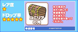 ●当選アイテム一覧(計11種類) 激レアアイテム1,激レアアイテム2,祝福の宝石,生命の宝石,創造の宝石,霊魂の宝石,混沌の宝石,ディノラントの角,守護天使,サタン,ユニリアの角 ※激レアアイテム1と2は,毎月当選アイテムを発表し,翌月末にアイテムの贈呈を行う