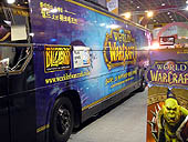 上段左:Blizzard EntertainmentのWorld of Warcraftブース。WoWクライアントCDパッケージを大量配布中だ 上段中央:現在韓国全土を巡回中の,"WoWバス"がブース内に登場 上段右:一度WoWをプレイすれば,後ろの順番待ちの人を無視するほどに夢中に…… 下段左:RF OnlineのACCRESIA種族のキャラクターモデルと,記念撮影イベント 下段中央:RF Onlineは,ブースが3か所に分けてられているというユニークな展示方法で,観覧客達を楽しませていた 下段右:シェンムーオンラインの超大型ブース。香港の町をイメージした雰囲気