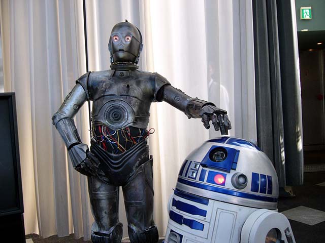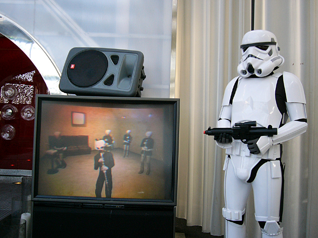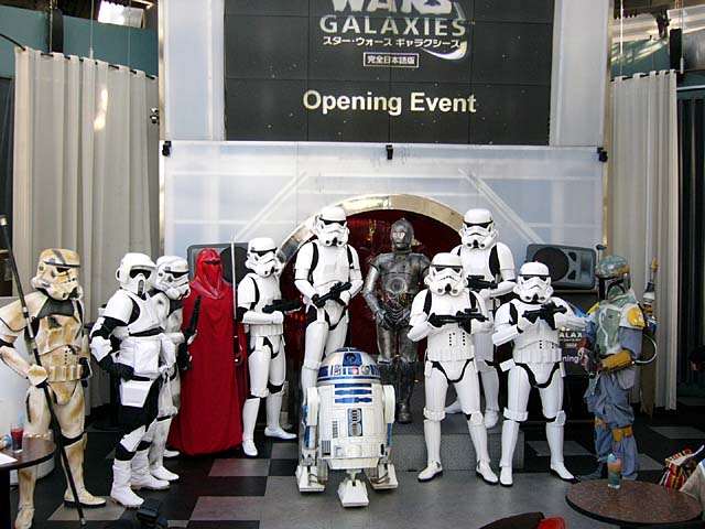受け付けで名刺を渡し,代わりにパスを受け取って店の奥に入……ろうとすると,ストームトルーパーに行く手を阻まれた。彼らはしばらく先述のパスをチェックし,OKが出て,初めて席に着くことができた。SWGのゲーム内での演出(プレイしている人ならご存じだろう)ってやつだろうか。 店の奥は,……それまで以上にスター・ウォーズ世界(?)だった。あたりはトルーパーだらけだし,二つの大型モニターと一つの巨大スクリーンでは,スター・ウォーズ関連の映像が流れている。さらに,筆者の席の前にポツンとたたずんでいたのは,R2-D2である。このR2-D2,正直,最初はただの飾りだと思っていた。しかししばらくのち,突然いつものあの声でしゃべりだし(近くにいたC-3POが翻訳してくれなかったので,何を言っているかは分からなかったが),あたりをウロチョロし始めたのである(あえて写真は載せないが,非常に貴重だと思われる,R2-D2の内部の機器を調整している場面まで目にしてしまった)。