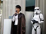 そんな状況下で始まった発表会は,やはり一般的なそれとは趣(おもむき)が異なるものだった。 まずエピソード4のダイジェストが流され,その後司会の女性が現れた。彼女もまた,受け付けの女性と同様,黒いマントを身にまとっている。この司会者は,デススターが破壊され(先ほどのダイジェストの終盤にこのシーンがあった),それに関わったと思われる反乱軍のメンバーを一刻も早く捕らえるために,帝国軍では新たな徴兵を行っていると話した。つまり,我々プレス陣および招待客は,その徴兵に応じて集まった志願者というわけだ。 なんだかよく分からないが,その司会者の「帝国軍の繁栄を祝して,乾杯!」という声と共にドリンク(さすがにアルコール類はなかったが)を飲み,発表会の本番がスタートした。