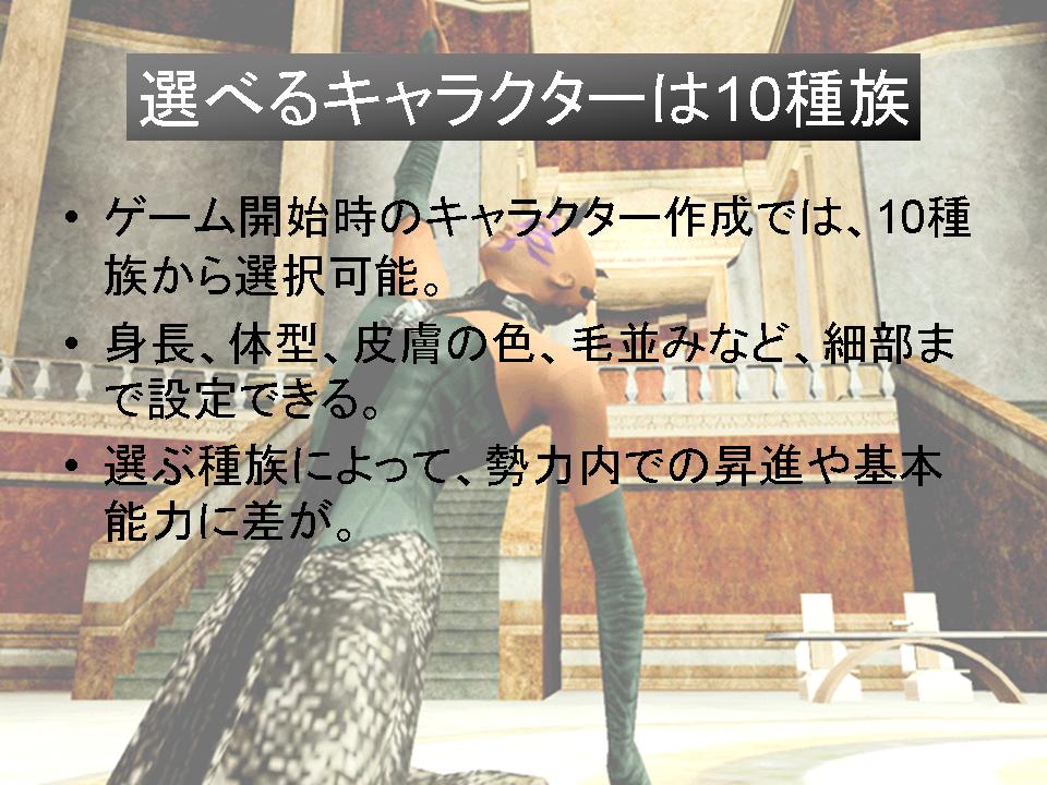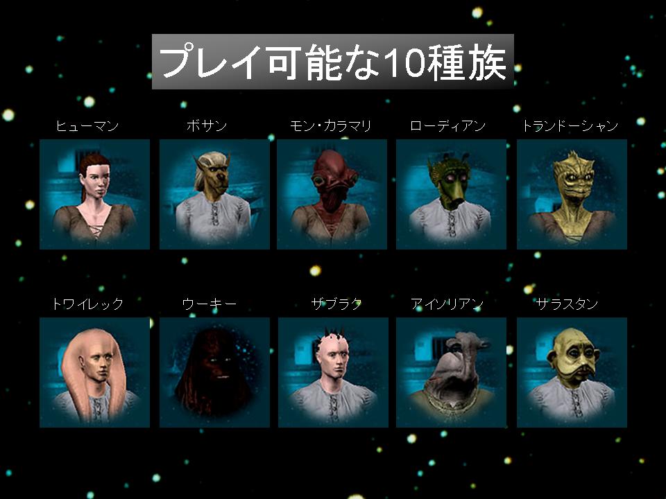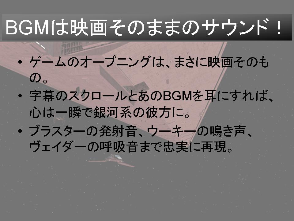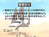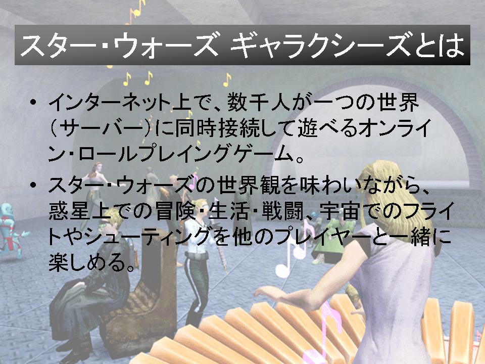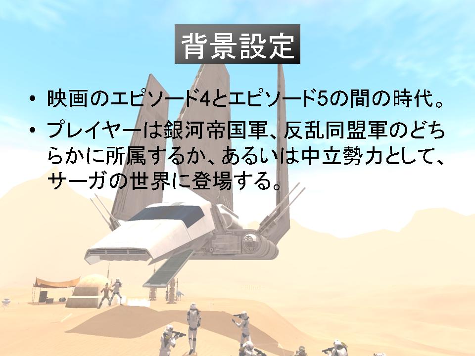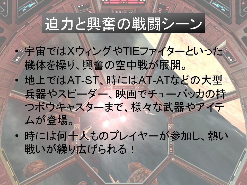 さて,この発表会という仮想世界(?)におけるSWGは,帝国軍が開発した新兵器という設定だった。この秘密兵器を使用することで,誰もがスター・ウォーズの世界へと入れ,銀河のさまざまな惑星に行けると司会者は説明した(「惑星だけに,ワクワクしますね。……ちょっと笑いましたね?」という司会者のジョークを,未だに覚えている)。 「これは遊びではありません。任務です。そこで我々帝国軍と協力関係にある,エレクトロニック・アーツの平岡君より,この新兵器を解説してもらおう」との司会者の紹介で登場したのは,同作プロデューサーへのインタビュー記事「こちら」でも少し話してもらった,同社マーケティング担当の平岡氏である。 平岡氏は,本作の特徴をムービーやスライドショーを使って,丁寧に説明してくれた。……ただ先述したとおり新情報はなく,当サイトの読者には聞き慣れた話ばかりなので,ここではそのとき使用されたスライドショーの画像を掲載するだけにとどめておく。もっと本作について知りたいという人は,連載記事「デススターより愛を込めて」か,当サイト内の本作紹介ページ「こちら」をご覧いただきたい。