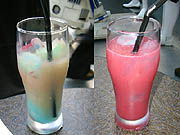 発表会の終盤で配られたドリンク。最初は白っぽい(左)が,かき混ぜると赤色(右)になるという,帝国軍にふさわしい飲み物だとか。意外と(?)おいしかった
