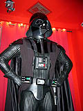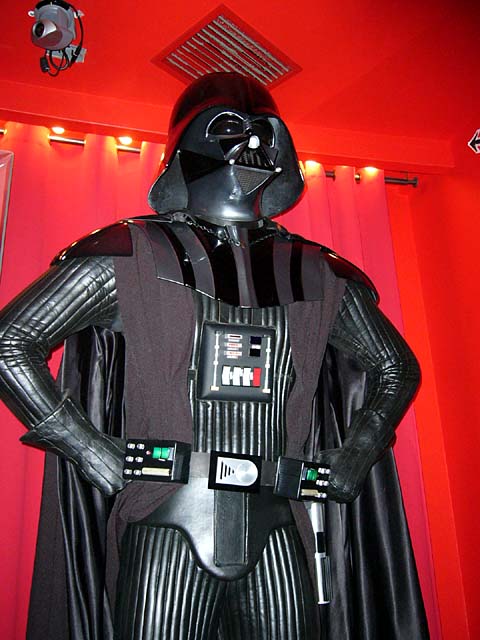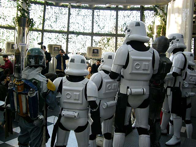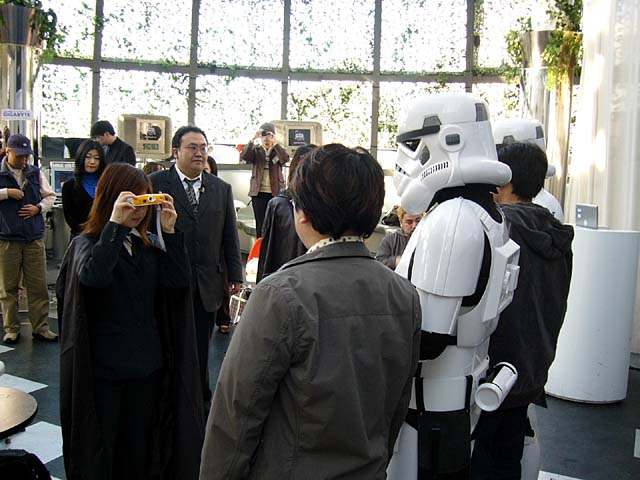 同店のある渋谷BEAMのエレベータを7階で降りると,歓迎してくれたのは美しいコンパニオンではなく,二人のストームトルーパーであった。奥にはドロイドの姿も見える。またガラス壁には,映画「スター・ウォーズ」のシーンが投影されている。 さすがに受け付けを担当するのは生身の人間(?)だったが,彼女達にしてもマントのようなものを身に着けており,雰囲気満点。見渡すと,スター・ウォーズ関連グッズが展示されていたり,ベイダー卿が「スター・ウォーズ公式クレジットカード」を宣伝していたりと,スター・ウォーズに関係ないものを探すのに苦労するくらいであった。