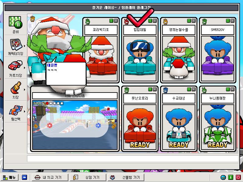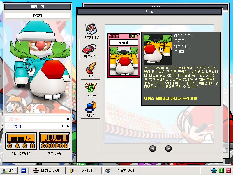 Kart RiderがPC Bangで好評ということには,ほかにも理由が考えられる。というのは,本作の場合,家からプレイするよりも,PC Bangでプレイしたほうが何かとお得なのだ。 例えば,家からではいくらお金を積んでも使用できない特殊なキャラクター(イラストを掲載したサンタのキャラクターなど)を,PC Bangからなら使用できるし,またレースで勝利したときも,家でプレイしていた場合の2倍のポイントを得られるようになっている。そのため,どうせ遊ぶのなら,PC Bangで遊ぼうと思う人が増えるわけだ。