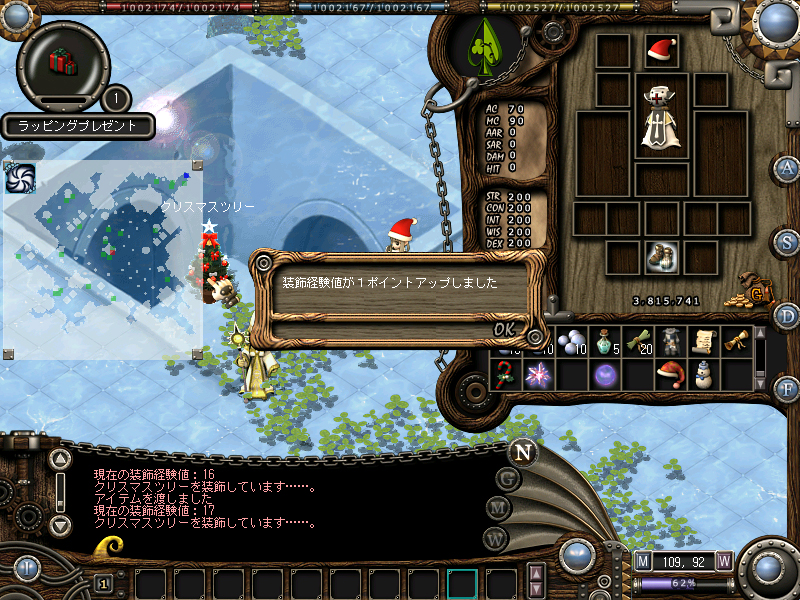 ドロップした場所など状況に応じてクリスマス限定のアイテムか装飾経験値が得られ,装飾経験値によってはさらにレアなアイテムがもらえることもある。つまり最初のうちは,装飾経験値を溜めるためにも,あまりアイテムがでないほうがいいわけだ。ピンキオを倒しまくって,ぜひともレアアイテムを手に入れてほしい。(Seirou)