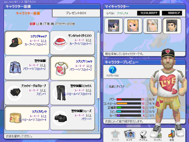 本日追加された新アイテムは,セシリアのピクニックドレス(20000PP),ピクニックスカート(18000PP),ブルーチェックテープ帽(11000PP),ブルーチェックハイヒール(25CP),ダイスケのラブラブTシャツ(39CP),ラブラブパンツ(33CP),ラブラブキャップ(35CP)など,さらにキャラクターを印象付ける衣装がメイン。セシリアの衣装は順当といったところだが,ダイスケの場合衣装と顔のギャップがあり過ぎて面白い。