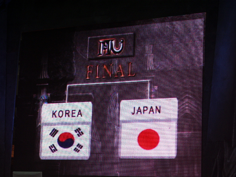 ■決勝戦■ 決勝戦は3試合行い,2本先取したチームが優勝というルールで行われた。第一ラウンドは,日本がアウェイの雰囲気をものともせず先取得点をあげる活躍を見せ,中盤までは実力伯仲の熱い戦いが演じられることになった。たが時間の経過とともに,日本は本作では一日の長がある韓国チームに少しずつ得点をとられてしまい,第一試合は前半が(77対100),後半が(22-113)で韓国が勝利。第二試合の前半は(51対117),後半は(55対100)といった調子で韓国チームが連取に成功。結局,優勝は韓国,準優勝は日本となった。 試合後,優勝した韓国チームは「中国と日本は強いチームだと思って熱心に練習をした。対戦をしてみたらやはり手応え十分で,日本チームは優勝してもおかしくない実力を持っていると思う」と高く評価。一方日本チームは,「試合の前から韓国と中国チームは対戦相手のキャラクターを攻撃して倒す戦術を使うのが分かっていた。でも,私たちは現実のサッカーと同様に純粋な試合を行った」とスポーツマンシップにのっとったコメントをした。