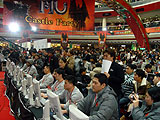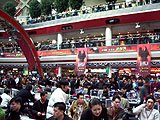 ■大会前日■ 大会前日(24日)は,全チームは市内観光をした後にレセプションに参加してチーム分け(抽選)を行った。日本代表チームは,事前情報から「中国,タイには要注意」とコメントしていたが,抽選の結果,皮肉なことにAブロックは日本,中国,タイとなり,Bブロックはフィリピン,台湾,韓国との結果になってしまった。 レセプション終了後は,全チームは会場近くのネットカフェでキャラクターの作成と作戦会議を行ったが,思いがけない組み合わせに事態を重く見た日本チームは,ほかのチームがホテルに帰ってもネットカフェに残ったまま打ち合わせ。結局深夜0時30分まで入念なシミュレーションを行い,さらにホテルに戻ってからも,遅くまでミーティングをしていたようだ。
