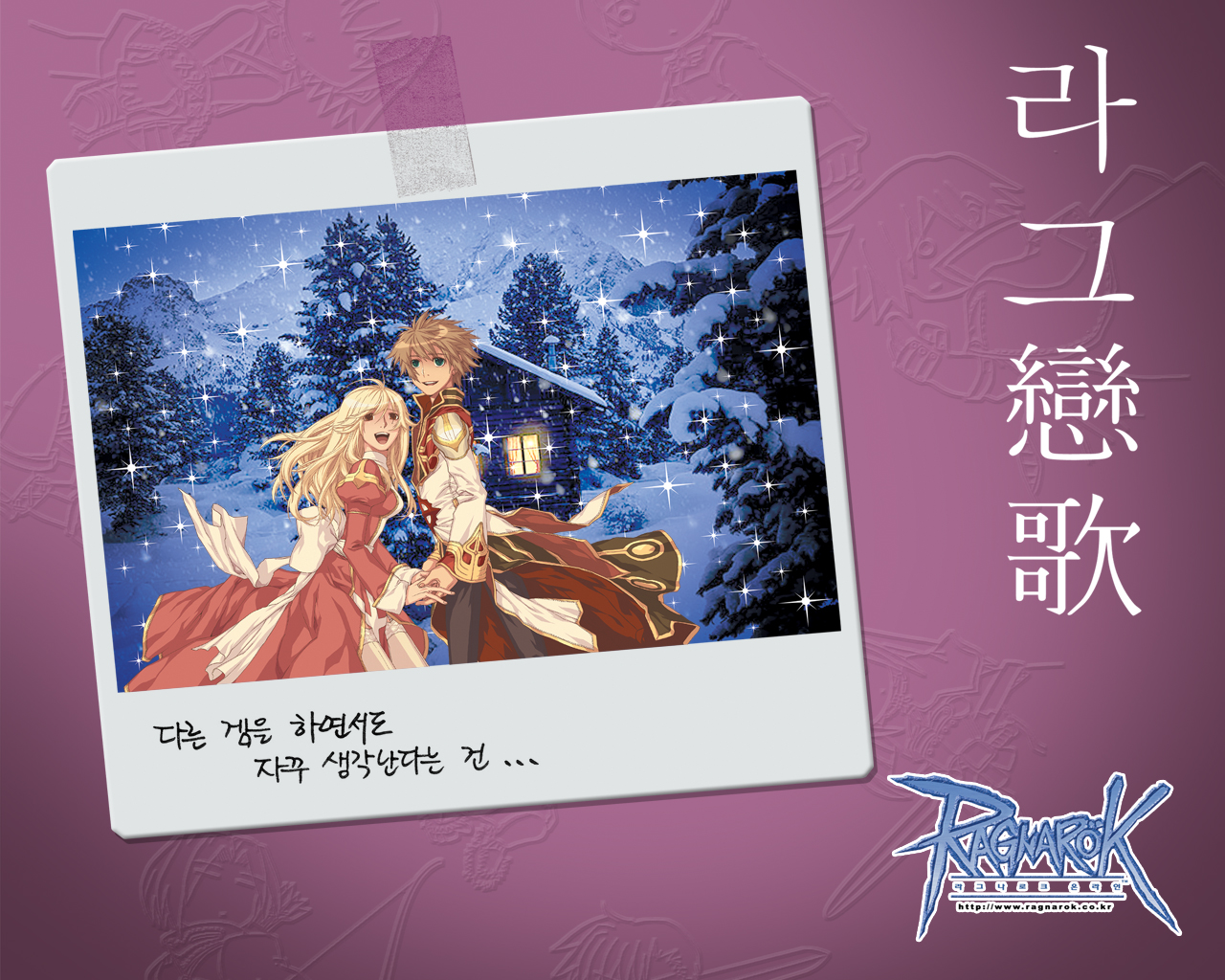 Gravity社は,最近「Ragnarok Online」(邦題 ラグナロクオンライン。以下,RO)の新しい広告キャンペーンとして,「ラグ恋歌」を始めた。この広告は,韓国の各種大手ポータルサイトやゲーム専門のWebマガジン,ゲーム雑誌など,至る所に掲載されている。 これまでのROの広告は,ゲームの楽しさを表現した明るいコンセプトのものだったが,ラグ恋歌は,元プレイヤー達の郷愁に訴えるコンセプトになっている。つまり目的が新規プレイヤーの獲得ではなく,あくまで以前ROをプレイした人の呼び戻しとなっているのだ。 具体的な内容は,過去にROを一緒に楽しんだギルドメンバー達を懐かしく思い,ほかのMMORPGをプレイしていても,ついROのことを思い出してしまう……というものになっている。 ちなみにラグ恋歌というタイトルは,日本でも大ヒットしたドラマ「冬のソナタ」の韓国タイトルである「冬の恋歌」からとられていると考えられる。つまり,「ROのソナタ」というわけだ。広告には,ROで一番人気の高いハイプリーストの男女のキャラクターを雪原の背景に合成した写真が使われていて,まさに冬ソナ的な雰囲気を醸し出している。