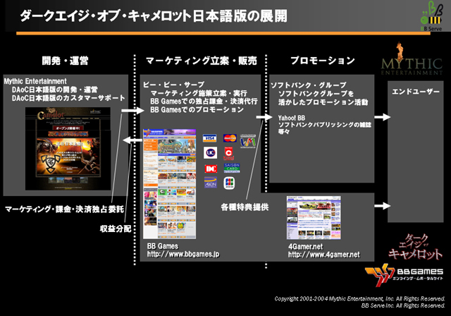 続いて,業務提携について国枝信吾から発表が行われた。今回の提携の意義として,DAoCのプレイヤー数の増加,BB-IDの増加,そして両社の収益の増加を挙げ,両社の役割としてMythicがDAoC日本語版の開発・運営,サポートを,BBサーブは販売やプロモーション分野を担当することを明らかにした。BBサーブはオンラインゲームポータルBB Gamesでの独占課金および決済代行やプロモーション,またソフトバンクグループのシナジーを生かし,グループ会社の流通や出版のチャネルを利用した展開を行うという。