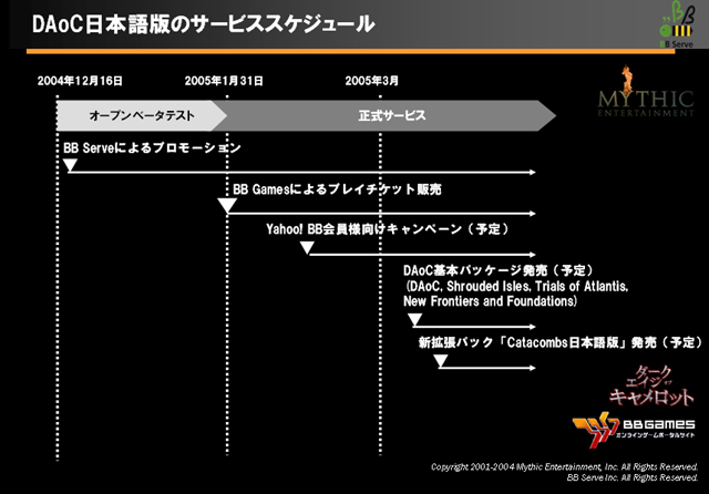 なお今後のスケジュールとしては,1月末か2月中にYahoo! BB会員向けの特典付きキャンペーンを実施(内容未定),そして3月にはDAoC基本パッケージ(ダウンロードできるクライアントと同じバージョン)の発売,そして同月に新拡張パック「Catacombs日本語版」がリリースされる。Catacombs日本語版はダウンロード/パッケージ展開どちらか未決定とのことだが,近々正式発表される模様だ。