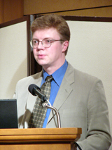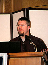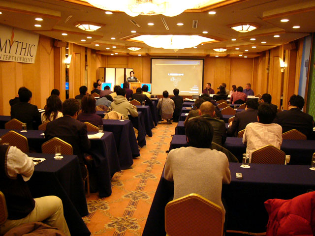 最初に登壇したのは,Eugene Evans氏。マイクを持つやいなや日本語で"こんにちは"と発言して場の空気を和ませていた(唯一話せる言葉らしい)。その後会社概要や,累計会員数が60万,現在の課金会員数が24万人を記録しているといった,DAoCのサービスの現状を一通り話した後,日本語版のリリースに関して「英語版でも多くの日本人が遊んでいたので,日本語版が出ることでさらに多くの人に遊んでもらえることを期待している」と締めた。 続いてMatt Firor氏によるDAoCの説明があり,「PvP(RvR)に重点を置くことで他のMMORPGと差別化を図っている」とまとめていた。そのほかゲームやジャンルの説明も行われたが,多くの読者にとってはご存じのことだろうし,何度も当サイトで触れてきたことなので,ここでは割愛させていただく。本作について詳しく知りたいという人は,「こちら」の特集などを参照してほしい。