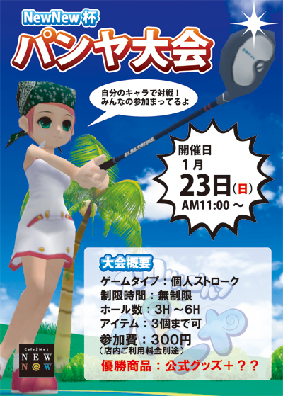 ゲームポットが運営中のオンラインゴルフゲーム「スカッとゴルフ パンヤ」を用いたイベント「NEWNEW杯 パンヤ大会」が,1月23日11時からインターネットカフェNEWNEW戎橋店と天神橋店で行われる。