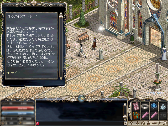 ・サファイア エンゲージリングとの交換 女性キャラクターが,高級サファイア1個と魔力の石100個を持っていくと,サファイア エンゲージリングと交換できる