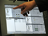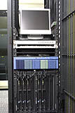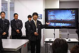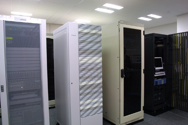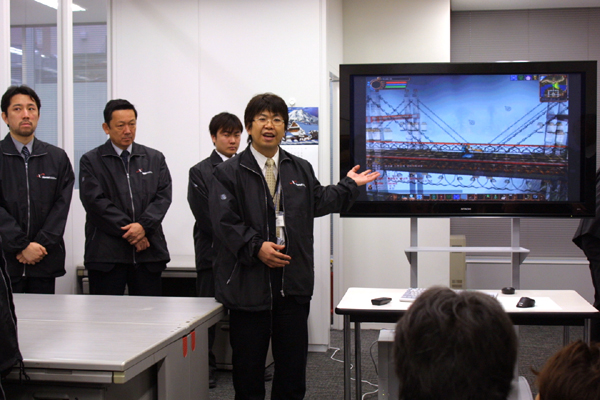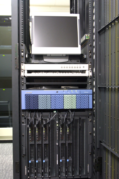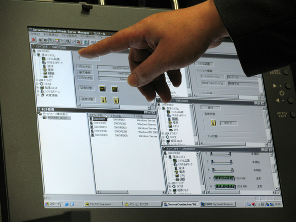 このあと,立食パーティ形式の開所式に移行する……前に,来場者達は,非常に貴重なものを見ることができた。なんと,サーバールームに通されたのだ。 ここでは,日立製作所のシステムエンジニアである安田氏から,サービスを安定的に提供するためのサーバーシステムについての説明があった。安田氏によると,現在使用しているサーバー(右の写真参照)は本番用のものではなく,あくまでも評価環境の設備とのこと。この設備を使い,アプリケーションの能力やプレイヤー状況を考慮して,本番の環境を構築するという。 さて,安田氏の語ったサーバーシステムについて詳しく説明していると,それだけでニュース3本分くらいの文章量になりそうなので,これについてはいずれ別途取材記事をお届けするとして,ここでは要点のみをお伝えしよう。 安田氏はこのシステムを構築するに当たって,三つの点に注力したという。一つは,"Manageability"。オンラインゲームの場合,数十台から数百台,多い場合だと千台を超える数のサーバーが構築されるが,それをいかに効率良くコントロールしていくかという点だ。次が,"Scalability"。負荷変動に柔軟に対応するという点である。そして,"Availability"。高い性能,高い信頼性を実現するという点である。 まぁ言葉にすれば実に当たり前のことばかりだが,そこは日立製作所。最新の技術,最新のソフト(同社の「JP1」)を使って,世界最高水準のサーバーシステムを構築しようという意気込みが感じられた。 ちなみに安田氏の締めの言葉は,「将来的にはこのラックが,この部屋いっぱいにズラッと並ぶようにしたい」というもの。ぜひたっぷり(それこそサーバー単位で千台以上)と揃えていただきたい。