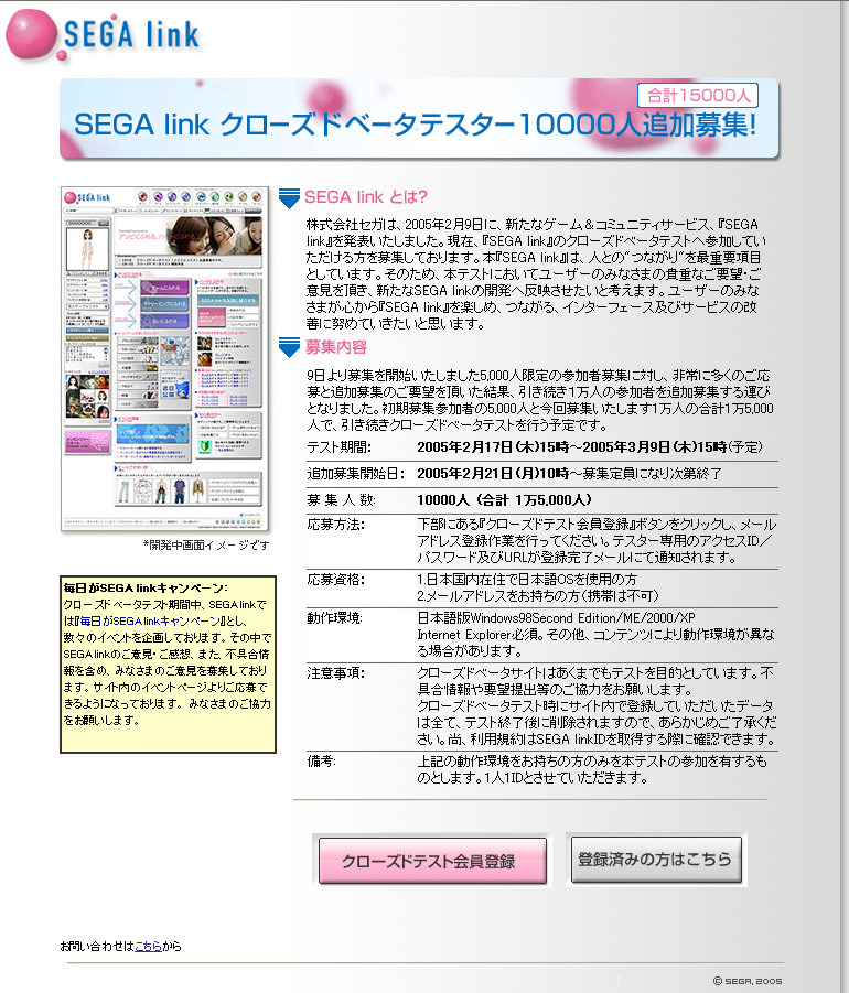 SEGA Linkは,2月9日に発表された,オンラインゲームやカジュアルゲーム,コミュニティ機能が集まったポータルサイト(記事は「こちら」)。 当初,5000人限定で2月17日よりスタートしたクローズドβテストだが,本日(2月21日)午前10時より,新たに1万人を追加募集(先着順)し,合計1万5000人でクローズドβテストが行われることになった。