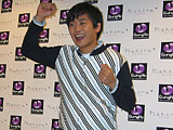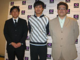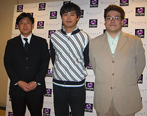 画面左は,劇団ひとりさんとガンホー関係者の集合写真。左から,ガンホー宣伝プロデューサーの越智氏,劇団ひとりさん,まほらのほしプロデューサーの飯野氏