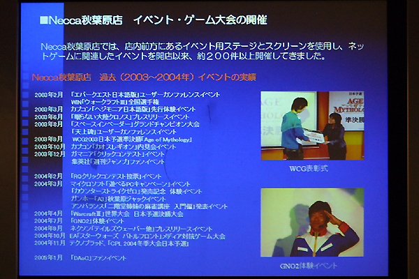 Neccaの試みは,端的にいうと「ネットワークに関わるもの」を"店舗"というオフラインの空間でどうビジネスに結び付けられるか,ということだ。実際にNeccaでは,メインコンテンツとなるネットワークゲームのほか,チャット,国際電話無料サービス,宣伝広告プロモーション,各種イベント,またソフトの販売など,非常に多岐にわたるビジネスを展開している。一時期は,ラオックス アソビットシティがオンラインゲームイベントの開催場所として頻繁に利用されていたが,同店舗の移転に伴いイベント開催フロアが姿を消したあと,再びイベント開催場としての地位を取り戻しつつある。現在は,年間50回ほどのイベントが行われているという。