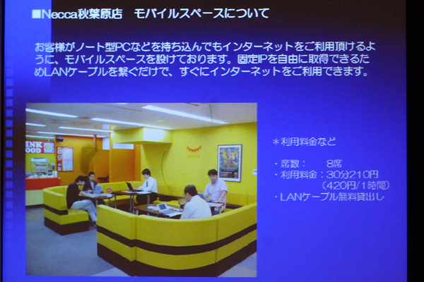 というのが,鈴木氏の見解だ。坪当たりのコストが低いのは立地の問題(考えてみれば,ネットカフェがビルの1階にあるのを見たことがない)が大きいわけだが,将来的に,大通りに面したビルの1階にネットカフェが登場したときが,勝利のときであると鈴木氏は締めくくった。