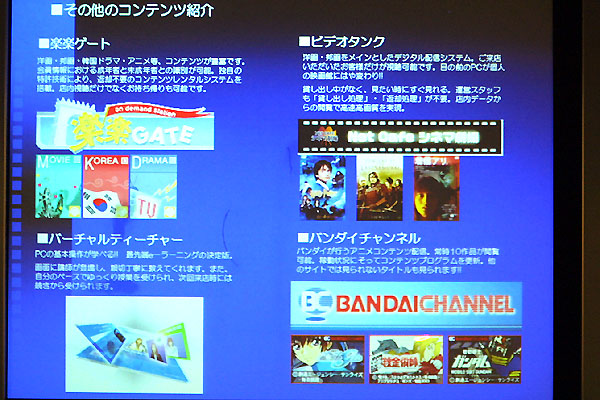 「アーケードゲームは,坪当たり平均して10万円ぐらいのコストがかかっている。これに対して,インターネットカフェならコストを半分以下に抑えられる。またクレーンゲームを10台買い取るだけで1千万円かかるところが,PCなら1台20万円程度。さらにPCは,専用のアーケード筐体よりも自由にソフトを入れ替えられる。このアドバンテージで,これからもリーズナブルなサービスを提供できるだろう」