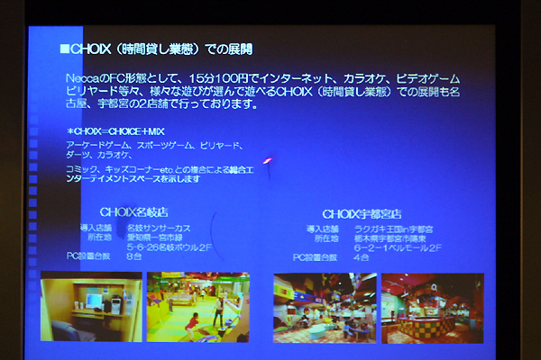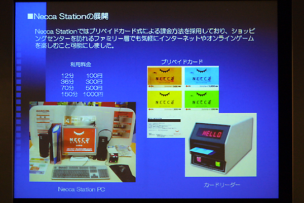 タイトーは,PC-BANGの韓国での普及を横目で見つつ「この業態は日本でも通用するのだろうか」と,2003年1月,渋谷にNecca1号店をオープンした(ちなみにNeccaとは,「ネットカルチャーコミュニケーションエリア」の頭文字をとった造語)。Neccaはマンガなどを置かない非マンガ喫茶であり,PCにインストールできるコンテンツだけを重視するというコンセプトが,同フランチャイズの大きな特徴である。